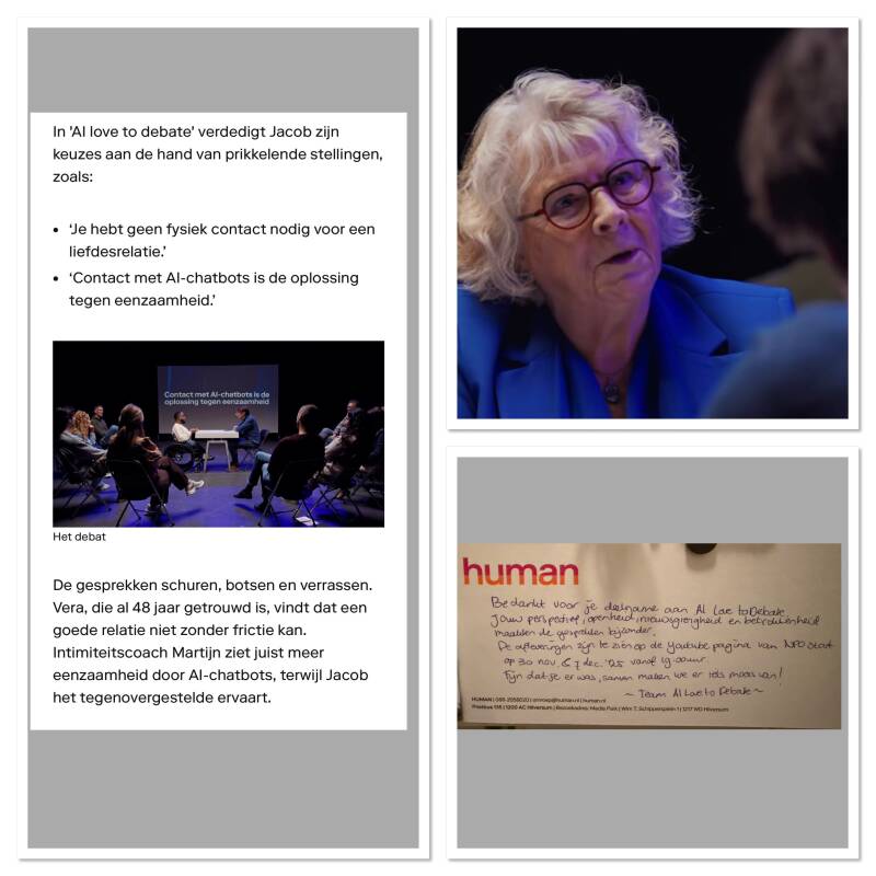 - “Graag zou ik met u in contact komen in verband met een nieuw online programma van Omroep Human. Voor dit programma zijn we ook op zoek naar enthousiaste ‘ouderen’ die het gesprek willen aangaan over liefde, relaties en AI”.